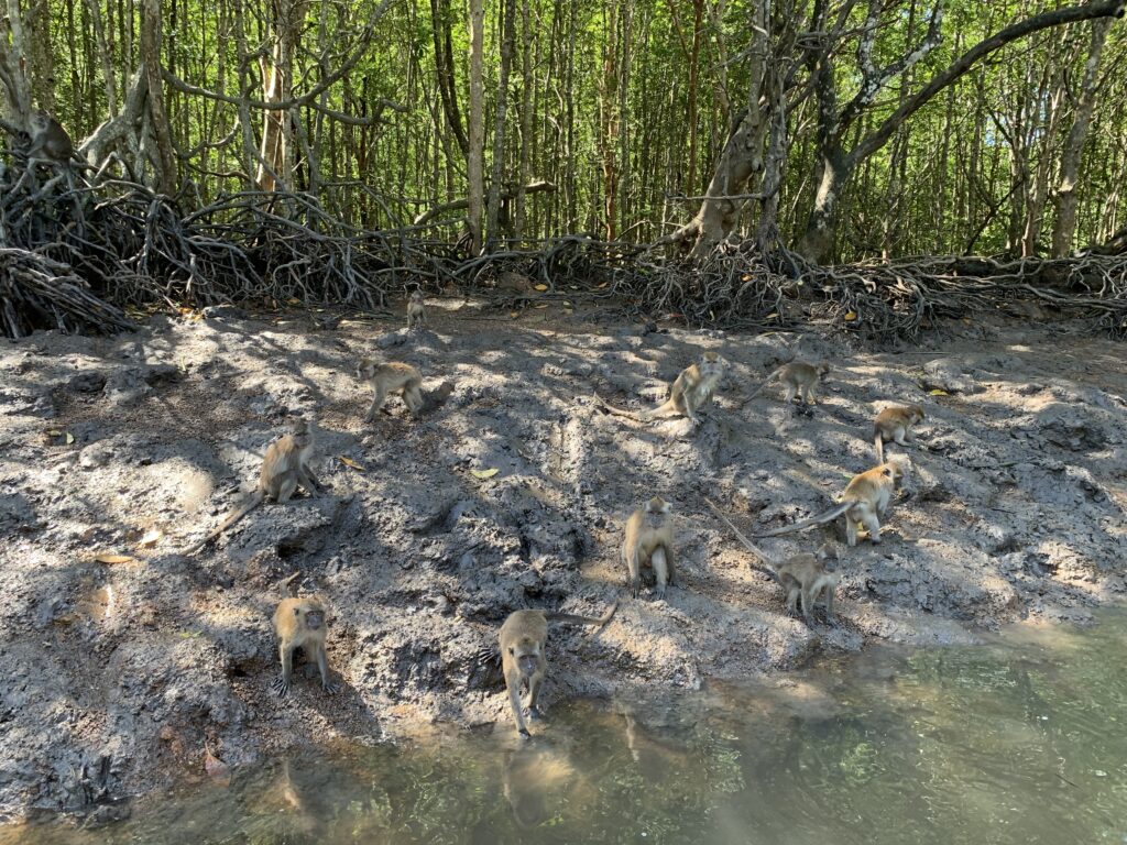 食後は、ホテルで申し込んだマングローブボートツアー(家族貸切ボート)に出かける。ホテルロビーから車で40分ほど走ってボート乗り場に。入口の出店でサルにあげる餌用のバナナを買い込んでから、貸切ボートで出発。