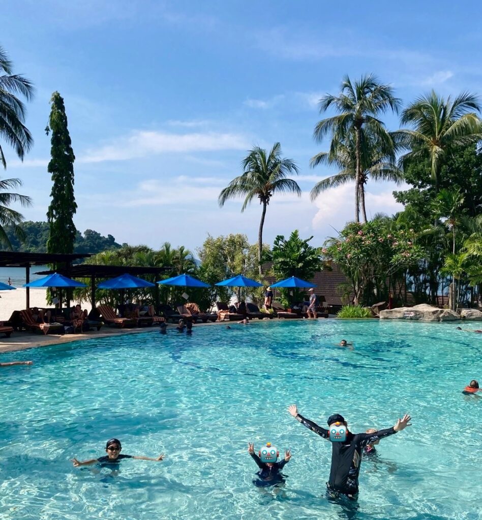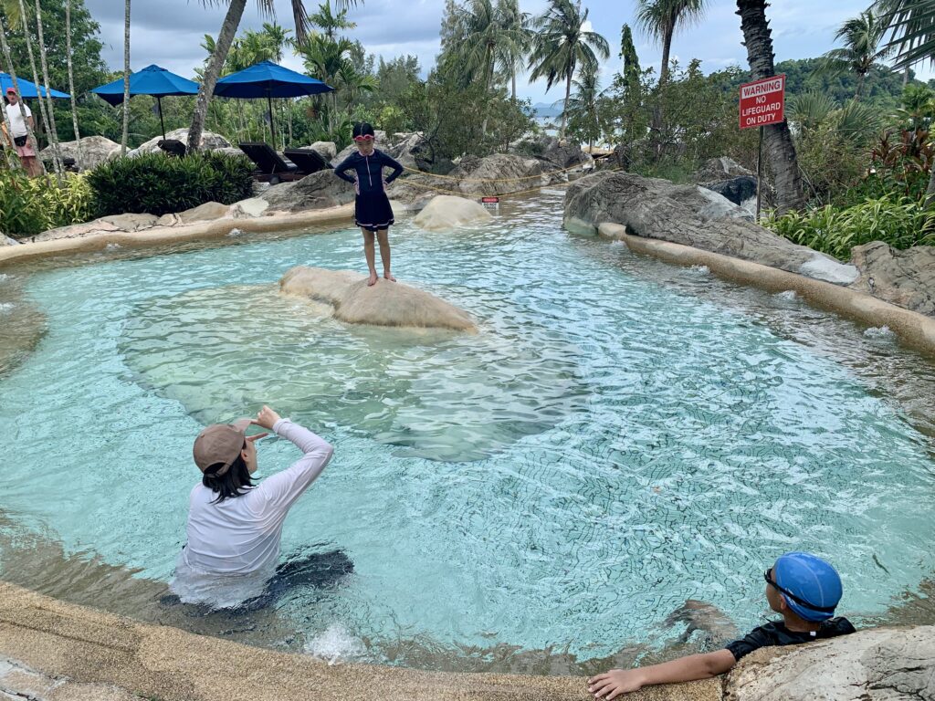 食後はホテルのプライベートビーチとプールに入水。海の水は透き通るほど綺麗でもなく、プールをメインに遊んだ。